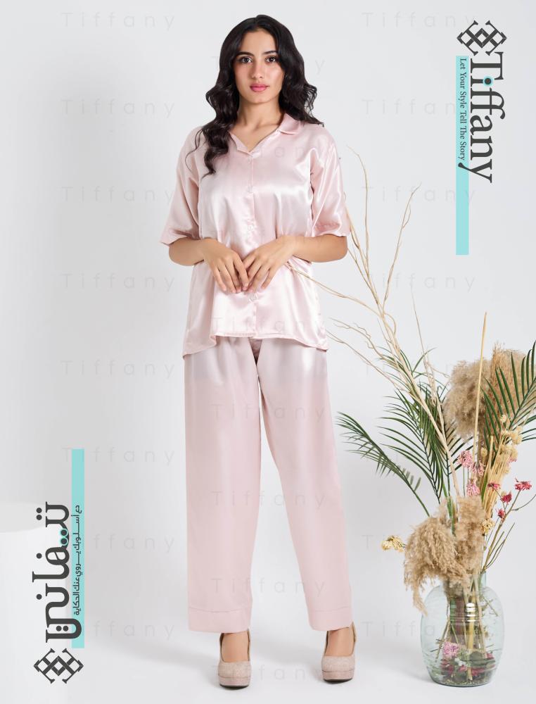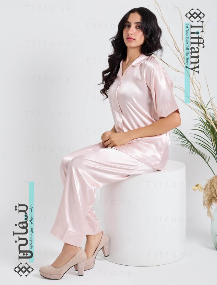 بجامة عروس قطعتين مصنوعة بالكامل من قماش الساتان الفاخر، ويتميز بتصميم كلاسيكي يجمع بين قميص بأكمام (قصيرة أو طويلة) وبنطلون طويل، مما يمنحه مظهرًا أنيقًا ومريحًا. يتميز الطقم بتفاصيل دقيقة مثل الحواف الراقية والأزرار التي تضيف لمسة من الفخامة.