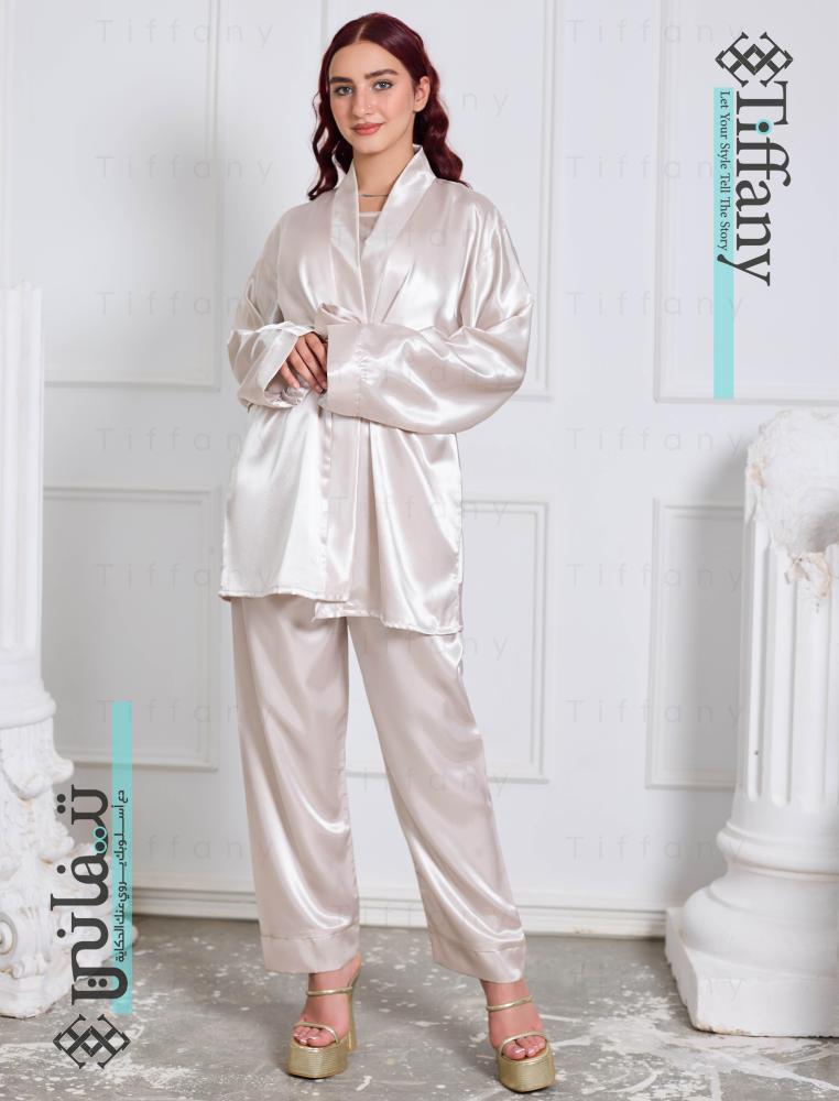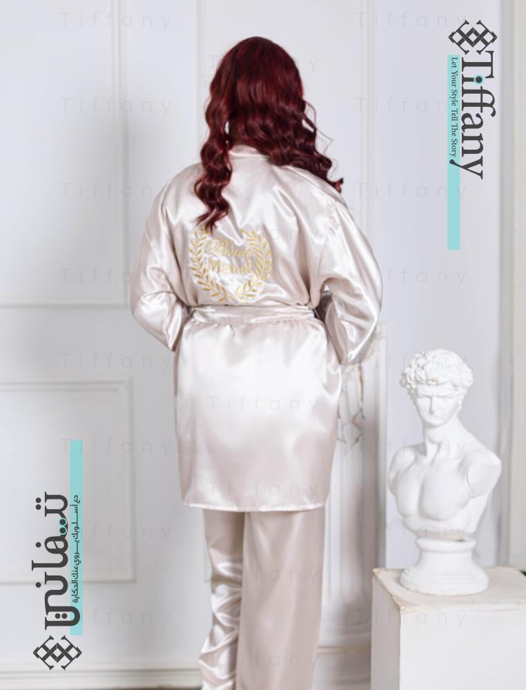بجامة عروس ٣ قطع (قميص داخلي+روب قصير+ بنطلون) مصنوعة بالكامل من قماش الساتان الفاخر، ويتميز بتصميم كلاسيكي مما يمنحه مظهرًا أنيقًا ومريحًا. يتميز الطقم بتفاصيل دقيقة مثل الحواف الراقية التي تضيف لمسة من الفخامة.