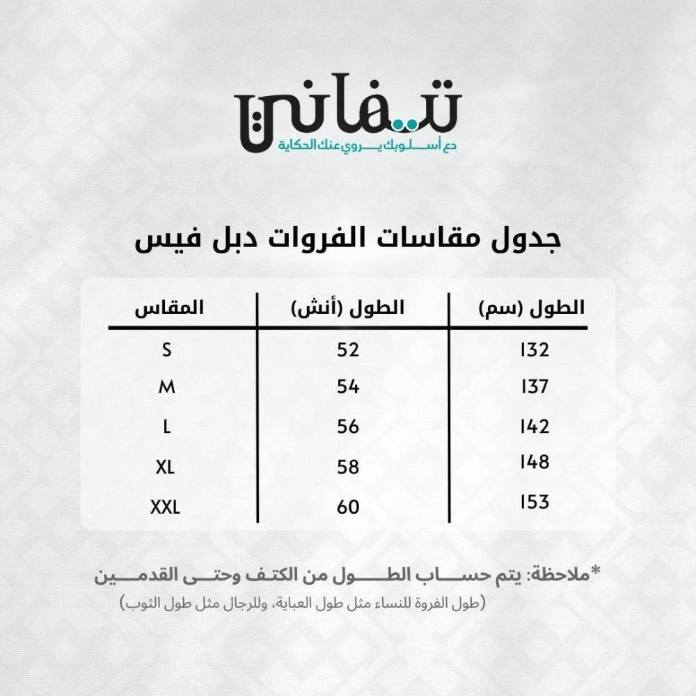 فروه شتويه للجنسين بتصميم أنيق ينلسب من الجهتين مصنوعة من أفخر أنواع الجوخ الإنجليزي الدافئ، حيث نضمن لكم في تيفاني السعودية أعلى معايير الجودة والإتقان ولذلك نقوم بحياكة كل جزء من أجزاء الفروه يدوياً بواسطة أيادي ذو خبرة ضليعة لأكثر من 15 سنة.