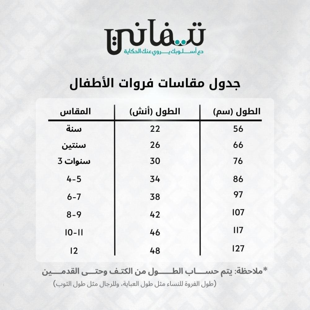 يتم تفصيل الفروات وفق المقاسات الأساسية الموضحة في جدول المقاسات في الأسفل:
